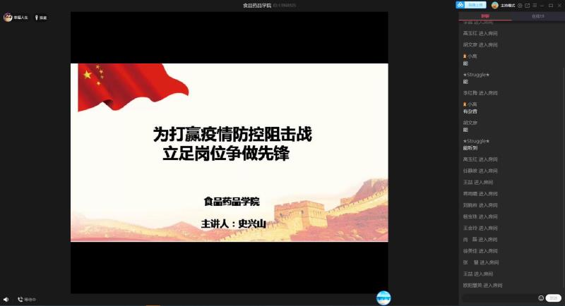 在疫情防控常态化的特殊背景下,为充分发挥基层党组织战斗堡垒作用和教师党员先锋模范作用,食品药品学院党总支书记史兴山于6月19日下午,做了一次主题“为打赢防控阻击战立足岗位争做先锋”微党课,党课采用QQ会议形式进行,全体党员教师在线参加学习。
