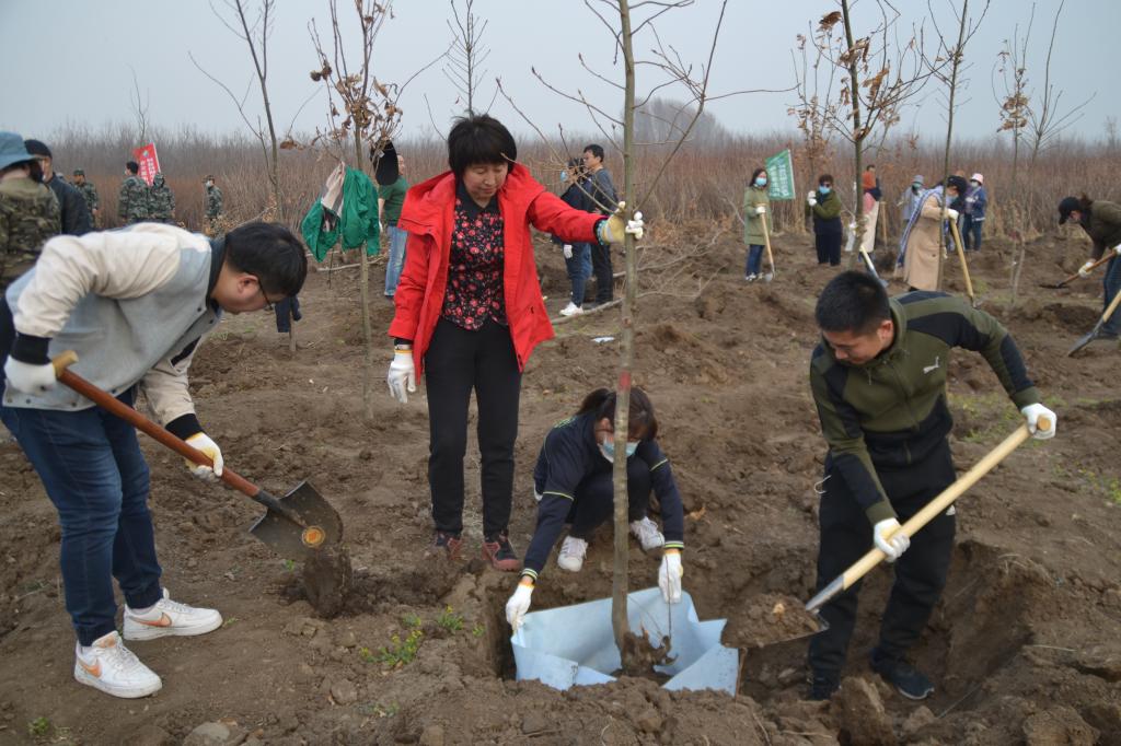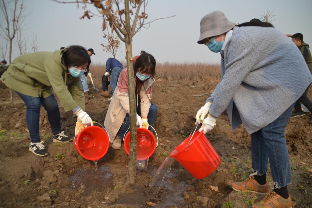 在植树现场,大家互相配合,分工协作,扶正树苗、挥锹培土、提水浇灌,配合默契,劳动现场呈现出一片繁忙有序、热火朝天的景象。在争先恐后、播种绿色的过程中,一棵棵新苗亭亭玉立,在蓝天白云下中形成一道美丽的风景线,春日的大地更加生机盎然。
