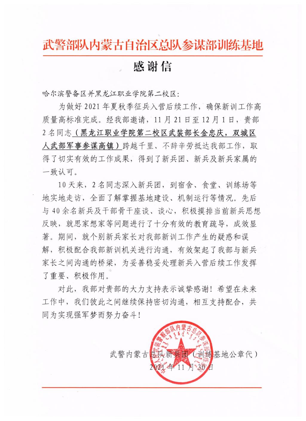 11月30日,一封由武警部队内蒙古自治区总队参谋部训练基地发出的感谢信,跨越千里传入永利集团88304官网第二校区。信中对学校第二校区武装部部长金忠庆、双城区人武部军事参谋高镇,受部队邀请前往部队深入细致地开展思想政治工作给予高度评价。