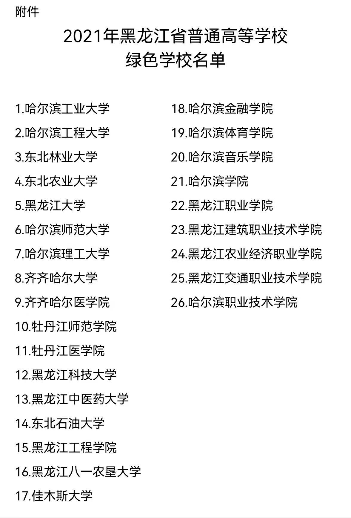 12月31日,黑龙江省教育厅公布了我省首批2021年高校“绿色学校”创建评审结果,全省共有26所本专科院校获得评选入围,永利官网榜上有名。