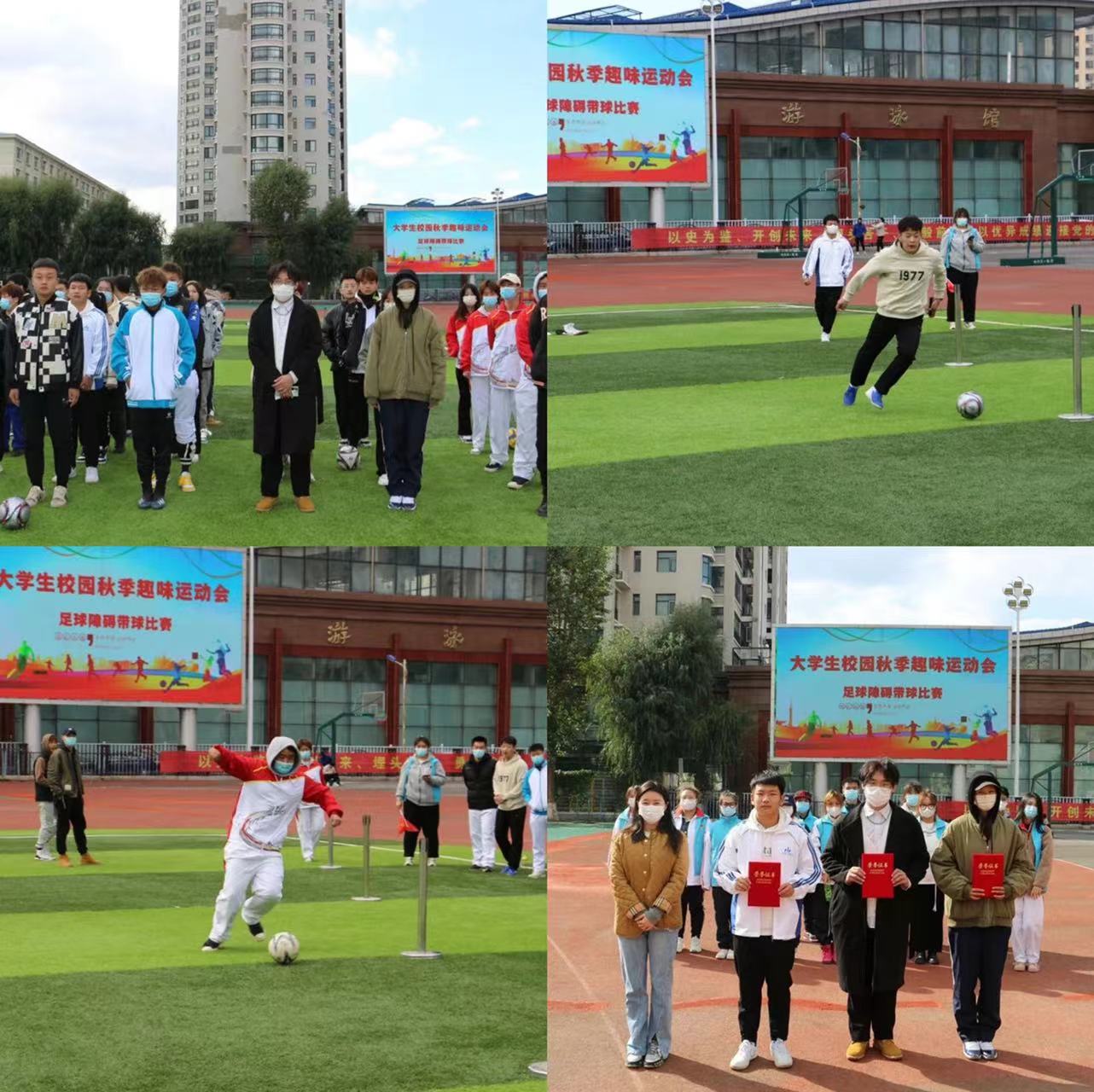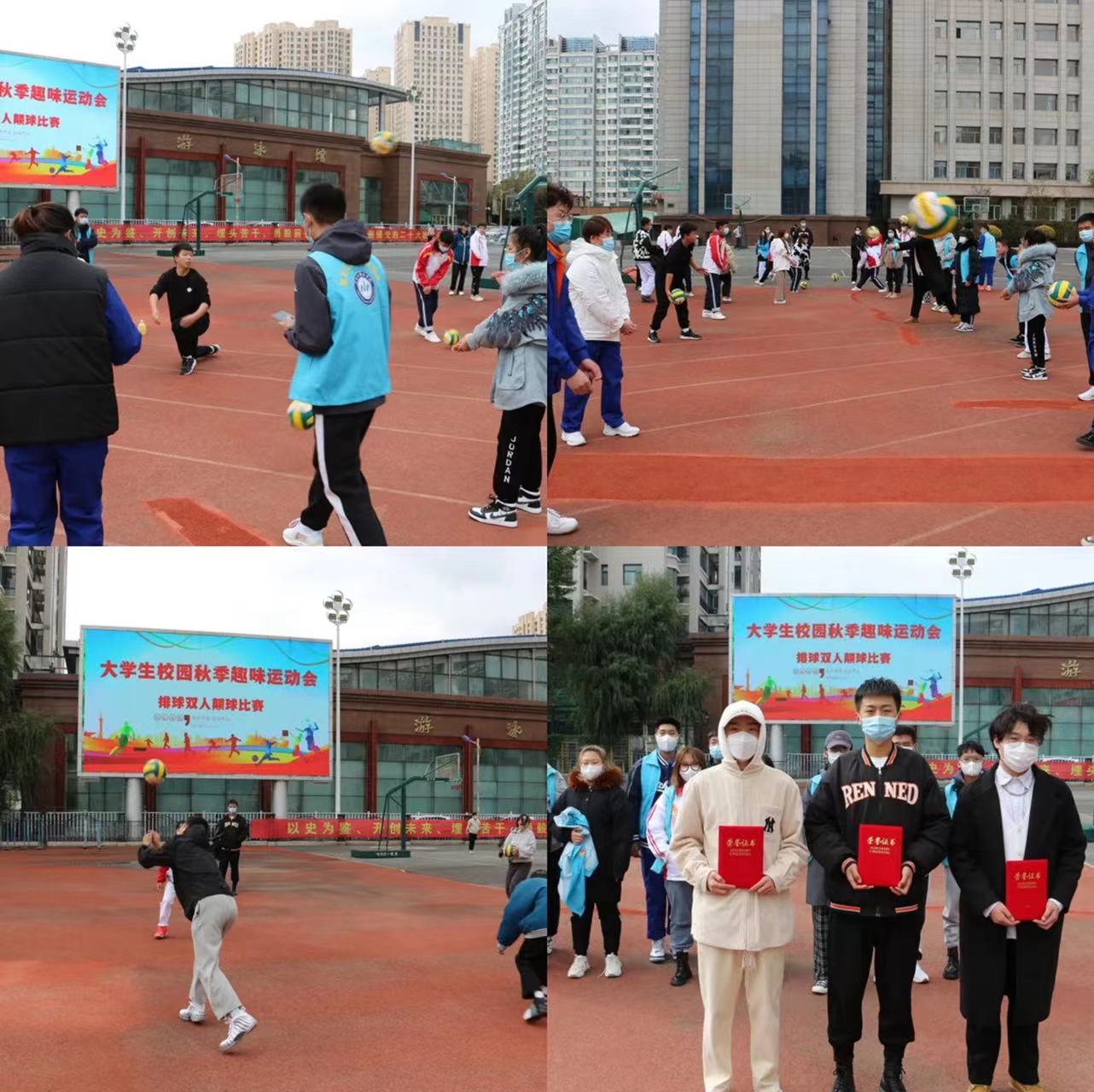 在校团工委、校学生会、校社团联合会、校学生新媒体等学生组织工作人员的认真组织下,在各二级学院广大学生的积极参与下,在后半程赛事中,参赛选手经过激烈角逐,最终,工商管理学院获定点投篮比赛冠军、旅游与人文艺术学院获排球双人颠球比赛冠军、工商管理学院获足球障碍带球比赛冠军、旅游与人文学院获校园拔河比赛冠军。赛后,校团委唐晓恬、魏然、马雨薇老师分别为获奖个人和集体颁发荣誉证书和奖状。