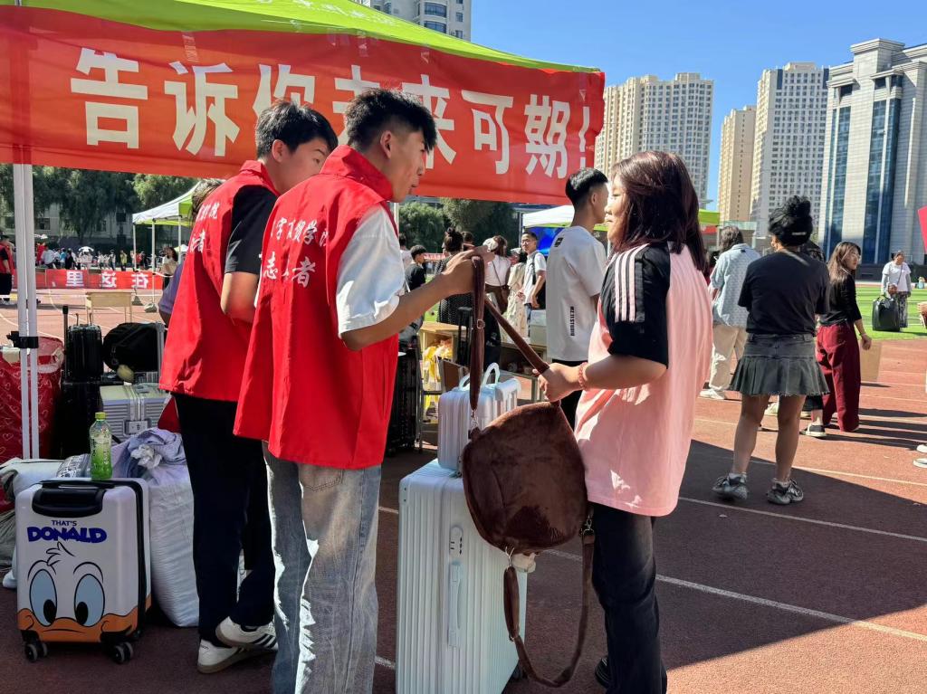 ▲志愿者帮助新生现场报道