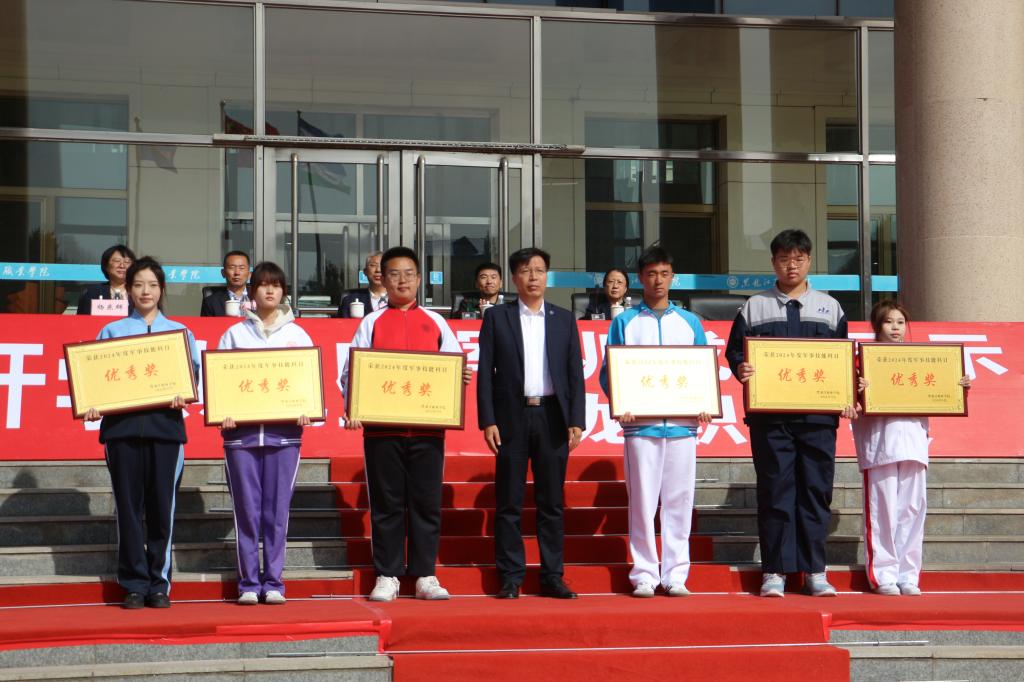 学校领导为军训中取得优异成绩的先进集体颁奖。