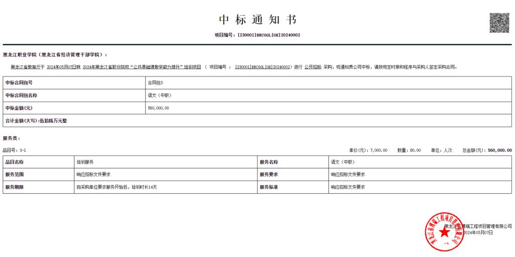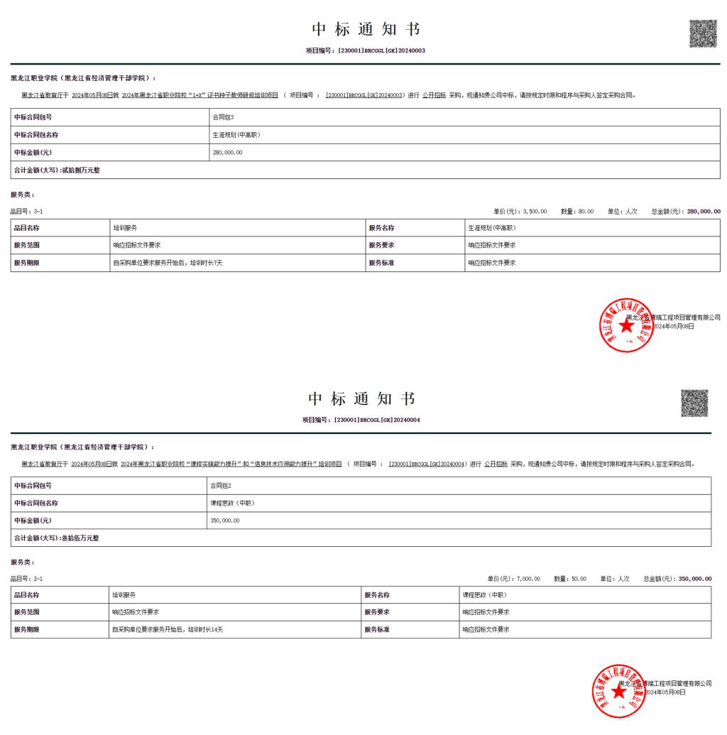 5月8日,永利官网参加2024年黑龙江省职业院校“课程实施能力提升”和“信息技术应用能力提升”培训项目、2024年黑龙江省职业院校“1+X”证书种子教师研修培训项目、2024年黑龙江省职业院校“公共基础课教学能力提升”培训项目竞标,凭借良好的学校声誉及科学的项目方案顺利中标语文(中职)、生涯规划(中高职)、课程思政(中职),中标金额119万元。