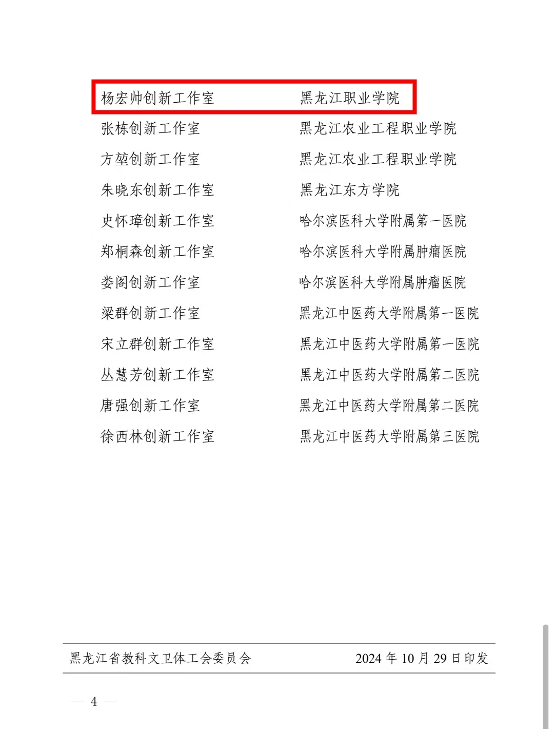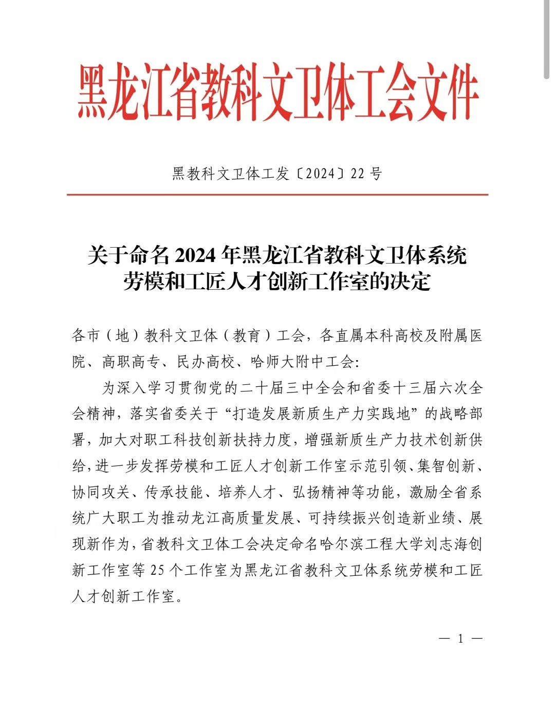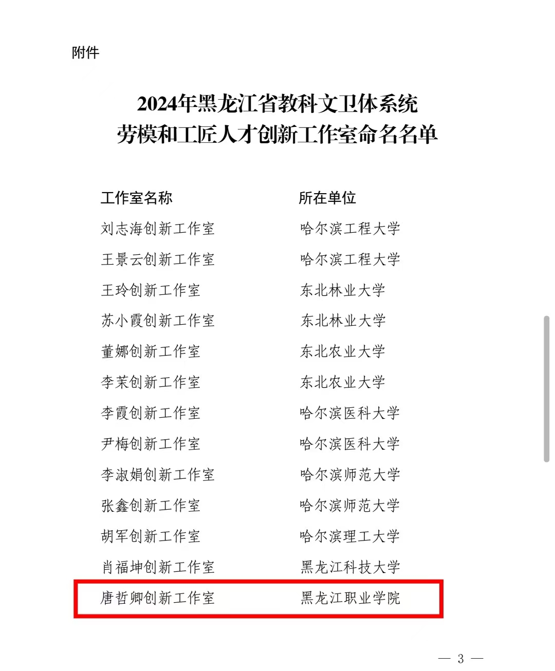 近日,省教科文卫体工会下发《关于命名2024年黑龙江省教科文卫体系统劳模和工匠人才创新工作室的决定》,全省共25个工作室获评省教科文卫体系统劳模和工匠人才创新工作室,永利官网唐哲卿创新工作室、杨宏帅创新工作室获此殊荣。