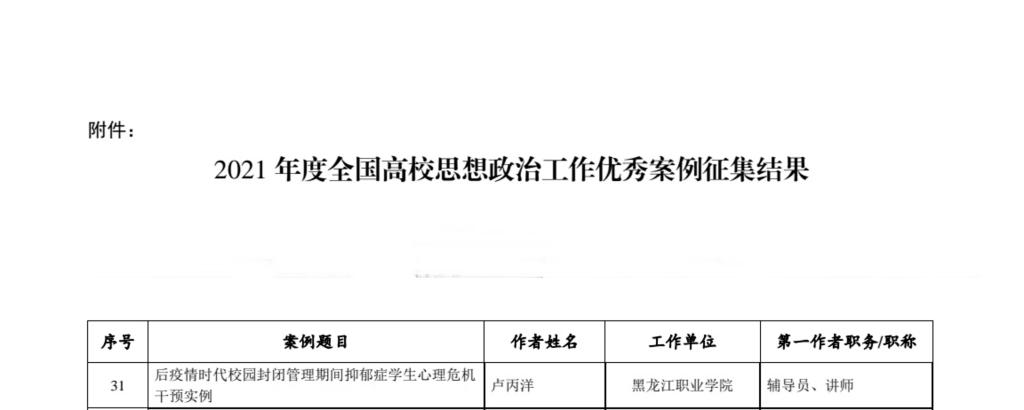 辅导员队伍专业化程度居省内高职院校前列。学校加大培训力度,积极参加教育部辅导员研修基地、黑龙江省教育厅组织的各类线下培训;积极组织“高校思政网、高校辅导员、黑龙江辅导员”等线上培训;引入“ECE卓有成效教练型教育者”“GCT生涯团体辅导”等专业化认证培训;组织高校就业指导教师线上训练营、生涯规划在学生辅导中的实务应用的培训;积极推进“易班工作站”“优秀辅导员工作室”建设,并已于2022年4月14日正式上线。近年来,学校组织参加校内外各类培训50余次,多数辅导员获得各类专业认证证书,辅导员培训力度和专业化程度在省内高职院校中均处于领先位置。永利官网辅导员卢丙洋编写的《后疫情时代校园封闭管理期间抑郁症学生心理危机干预实例》被收录在2021年度全国高校思想政治工作优秀案例中。