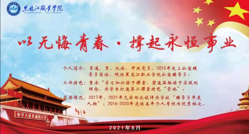 在中共黑龙江省委宣传部和中共黑龙江省委教育工作委员会联合举办的第十三届“黑龙江省高校辅导员年度人物”暨2021年“黑龙江省最美高校辅导员”推选展示活动中,经学校推荐、资格审核、专家外审等程序,学校公寓辅导员常通经过层层选拔成功入围网络述职答辩环节,并在2021年8月5日举行的“VS互动云”网络平台述职答辩中,荣获第十三届“龙江高校辅导员年度人物提名”荣誉称号,位列全省高职院校参评选手第二名。