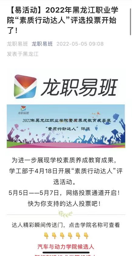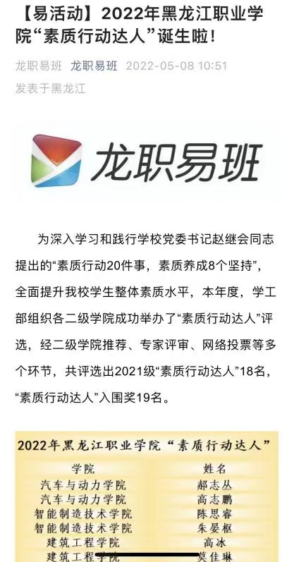 在为期一个月的活动中,全校师生广泛参与,通过二级学院选送、线上专家评选、网络投票、微信平台展播等形式,共展出学校各二级学院素质养成教育成果9个,评选出2022年“素质行动达人”18名,提名奖19名。本次活动在校易班公众号推文累计浏览超过14400人次,“素质行动达人”评选网络投票6615人次,充分展现了学校素质养成教育成果。