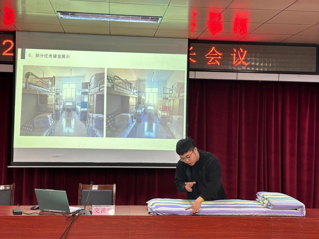会上初鹏皓老师结合《学生手册》中的相关规定强调了“公寓安全与应急处置要点”,为寝室长们上了一堂生动的安全教育课,杨涛老师现场为每位同学细致讲解并示范灭火器的使用方法;魏博老师从“日常秩序及归寝管理”的角度出发,强调了秩序井然对于维护公寓良好氛围的关键作用,并鼓励寝室长们成为这一过程中的中坚力量;王洪多老师聚焦“标准化寝室”建设,详细阐述了如何通过共同努力,将每一间寝室都打造成为整洁、温馨舒适的宜居空间,退役士兵王鹏博现场分享了精湛的叠被技艺,他边操作边与学生互动,向学生传递了培养良好习惯的重要性。