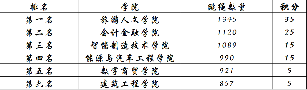 为深入贯彻落实习近平总书记关于志愿服务精神的重要论述,结合“国家健康三年行动”计划,引导学生“走下网络”“走出寝室”“走向操场”,校团委定于2025年3月20日 - 4月20日开展以“绿动青春,志愿先锋”为主题的志愿环保活动月。旨在激发同学们的运动热情、加强学生正确的健康观念,引导学生树立正确的生活习惯、运动习惯和健康习惯。4月8日开展全民健身大学生趣味体育竞赛第三期——快速跳绳决赛。