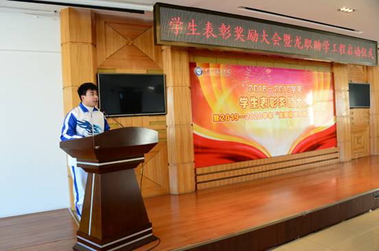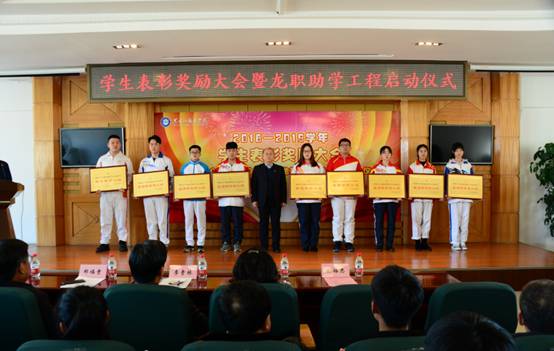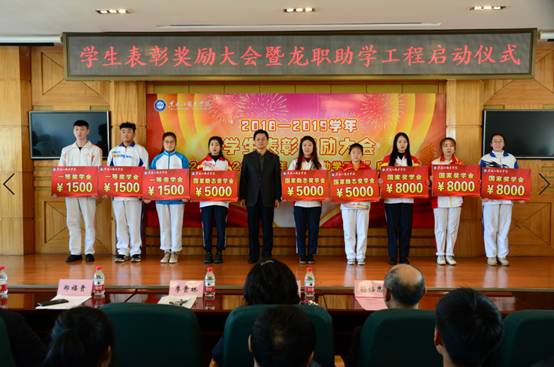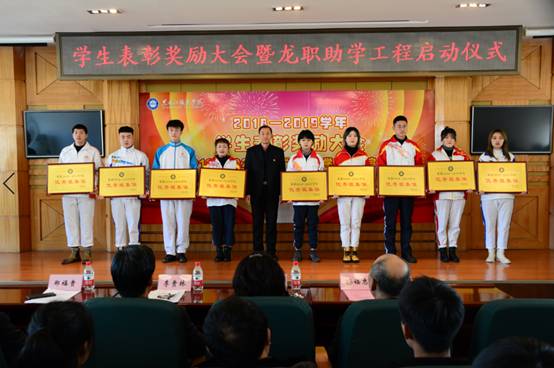 会上,学校为1101名学习勤奋刻苦、品学兼优的学生颁发了奖学金;为41个班风优良、团结协作的优秀班集体颁发了奖牌;为9个学风端正、成绩显著的学习小组颁发了奖牌;为607名三好学生、优秀学生干部等先进个人颁发了证书。今天,有100名干部教师与100名受助学生结成“一帮一”对子,精准帮助这些学生顺利完成学业。2019年全年两个学期,学校共发放各类奖助学金1119.845万元,奖励资助学生6085人次;发放国家助学贷款1579.21万元,2078名学生受益。今天,又为304名家庭经济困难学生发放越冬棉衣,为170名经济困难学生购买返程车票。这些助学举措是落实党中央实施精准扶贫的具体举措,也是爱心龙职,当好学生铺路石的重要体现。