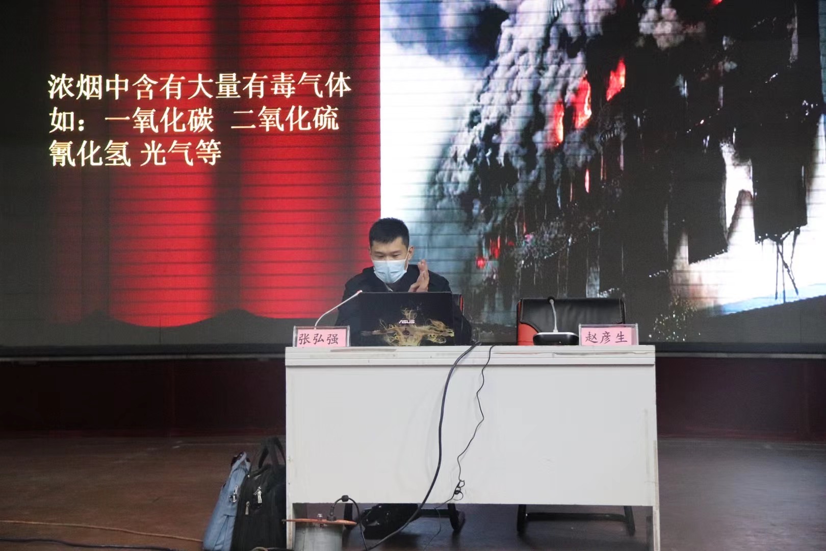 首先,来自黑龙江省五进消防培训中心张弘强主任对新生做了消防安全讲座。张弘强利用多起消防安全案件实例,通过现场照片、录像,详细讲解了火灾类型、起火诱因、火灾预防、火场处置以及逃生自救方法等消防知识,起到了较好教育效果。