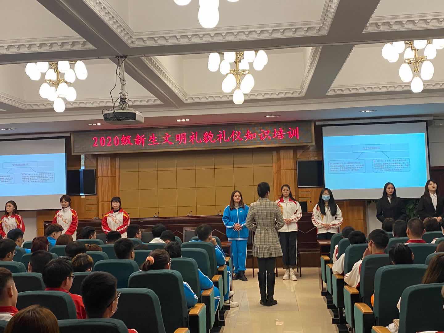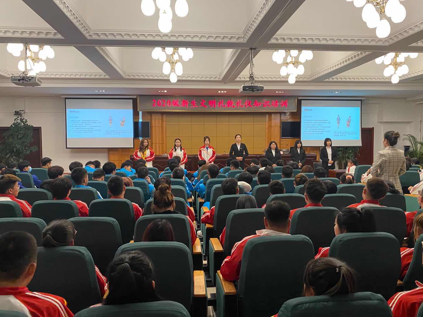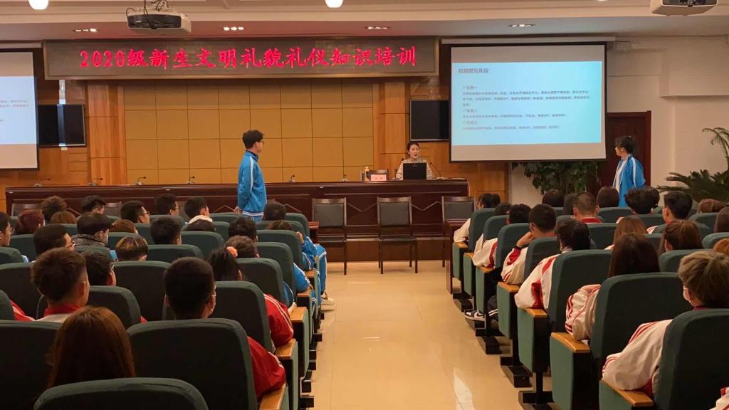为进一步推进素质养成教育,增强学生自尊、自信、自立、自强的精神,着力培养学生懂礼仪、高素质的良好形象,营造和谐的校园氛围。11月4日-5日,学校开展了2020级新生文明礼貌礼仪培训活动,邀请旅游与人文艺术学院高级礼仪培训师王琪主讲,各二级学院选派学生骨干300余人参与学习。培训分理论与形体实践两部分,运用理论讲授、情景模拟,角色扮演以及分组练习等培训方式,重点培训了微笑、握手礼、站姿、坐姿、师生礼仪及文明用语等礼仪规范。