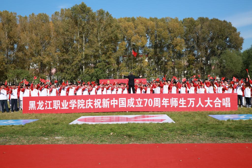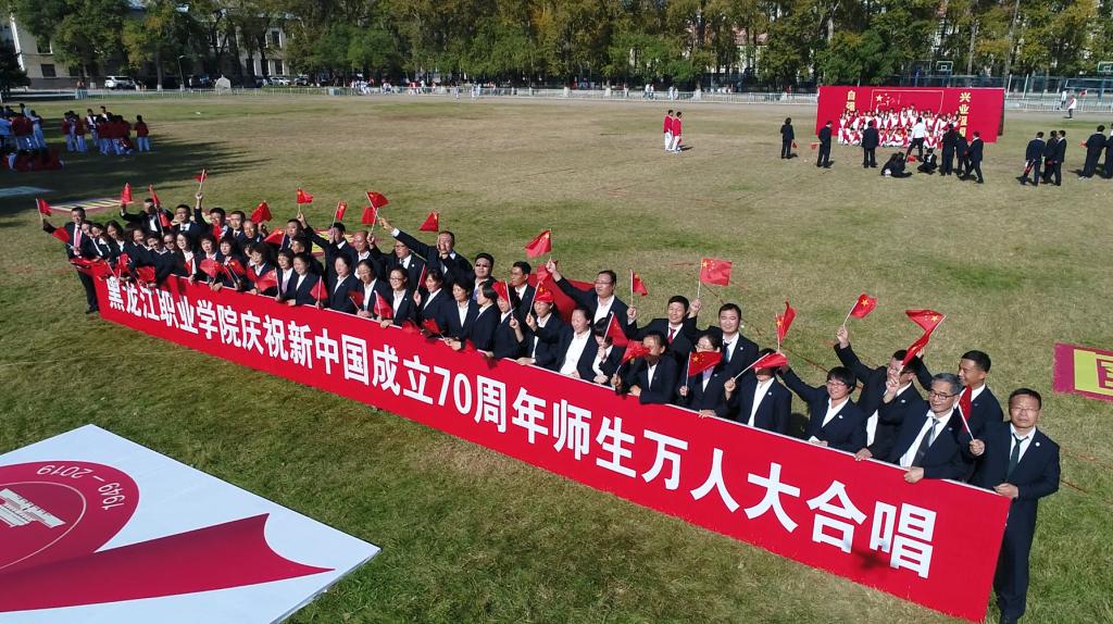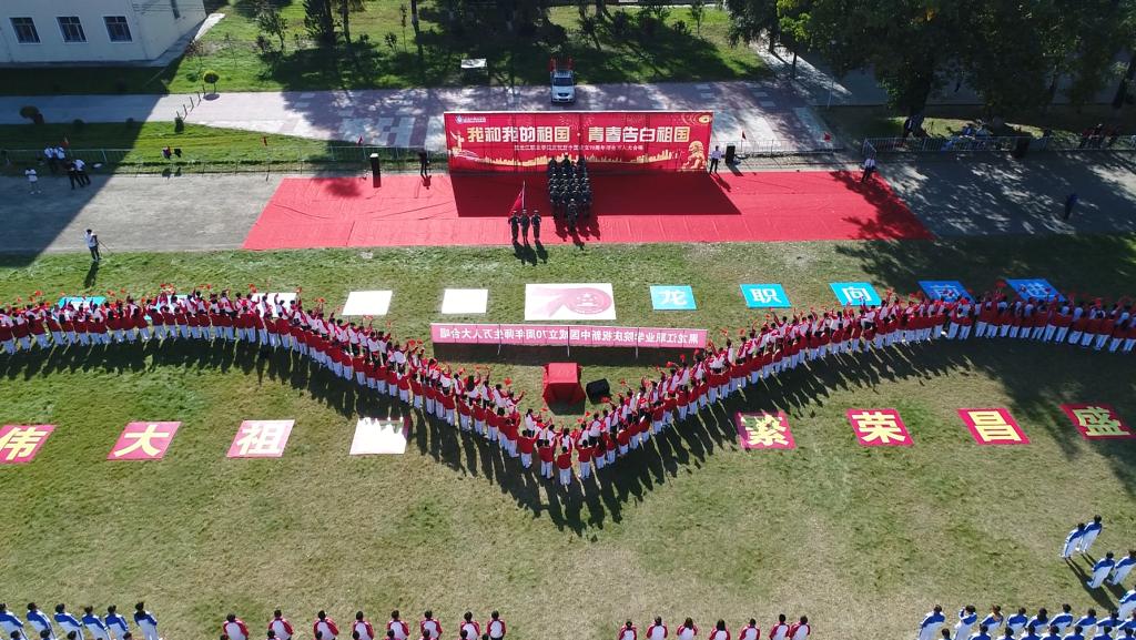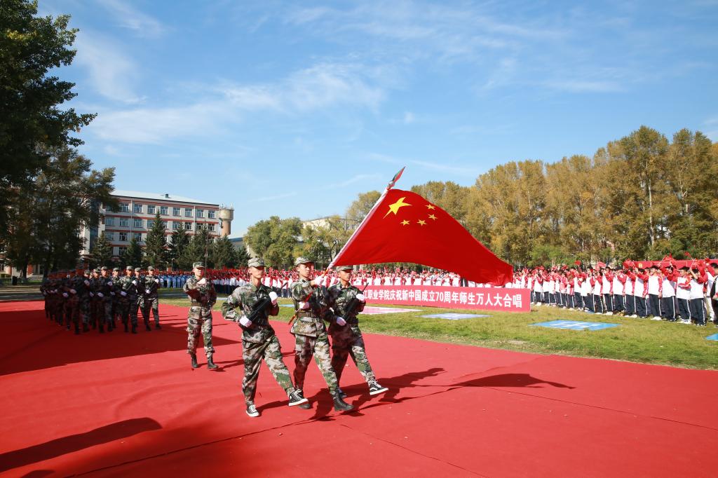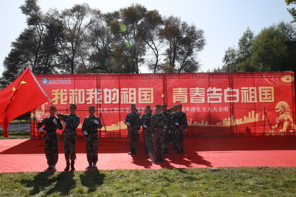 伴随着雄壮的《歌唱祖国》和19响礼炮,由学生组成的国旗护卫队踏着坚实的步伐,手挚五星红旗昂首挺胸走过观礼台,全场师生向五星红旗行注目礼,向伟大祖国表达深深的敬意。在“国庆再出发,龙职向前进”的呼号声中,全体师生从内心发出了《龙职之歌》的最强音,充分展现了龙职人敢为人先,勇争第一的豪情与气慨。