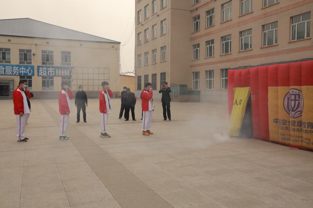 培训结束后,大家按照要求来到二号教学楼前广场,实地进入点燃发烟罐的“模拟逃生训练屋”,要求在16秒内逃出,否则会造成窒息。同学们的严肃认真地参加了演练,他们排着整齐的队伍,用毛巾捂住口鼻,猫着腰先后进入训练屋,结果有很多同学都没有在计划时间内逃出,同学们一致认为,在发生火情的房间内,如不快速逃生,浓烟才是令人窒息的真正原因,这种体验刻骨铭心。