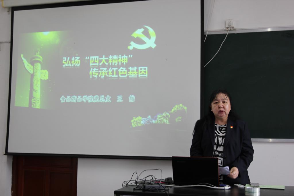 会议第三项由食品药品学院党总支组织委员、教学副院长王喆为大家上了一堂主题为“懂党史传承红色基因,用党史践行立德树人”的党课,主要从充分认识新时代深入学习和弘扬“四大精神”的重大意义、全面领会和准确把握“四大精神”的丰富内涵、把新时代深入学习和弘扬“四大精神”的任务要求落到实处三个方面进行了深刻的阐述。王院长讲到,作为一个时代的记忆,伟大的东北抗联精神、北大荒精神、大庆精神、铁人精神激发了全省人民的爱国热情,增强了全省人民的民族自信心和自豪感,成为中华民族伟大精神的重要组成部分。我们要加大新时代先进典型选树宣传力度,充分发挥示范引领作用,培育拼搏进取、创业创新的社会风尚。