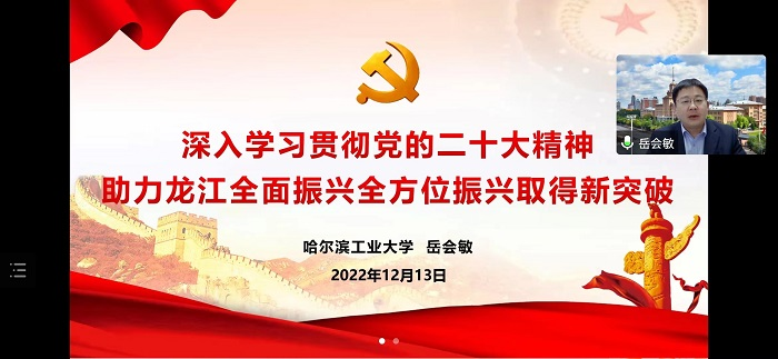 12月13日下午,黑龙江省教育系统学习贯彻党的二十大精神宣讲团为永利官网宣讲党的二十大精神,哈尔滨工业大学党委宣传部常务副部长岳会敏以《深入学习贯彻党的二十大精神 助力龙江全面振兴全方位振兴取得新突破》为题,线上为全校师生进行了提纲挈领、条分缕析的讲解。副校长郑福贵主持会议。学校领导班子成员、全体处级干部和师生代表参加会议。