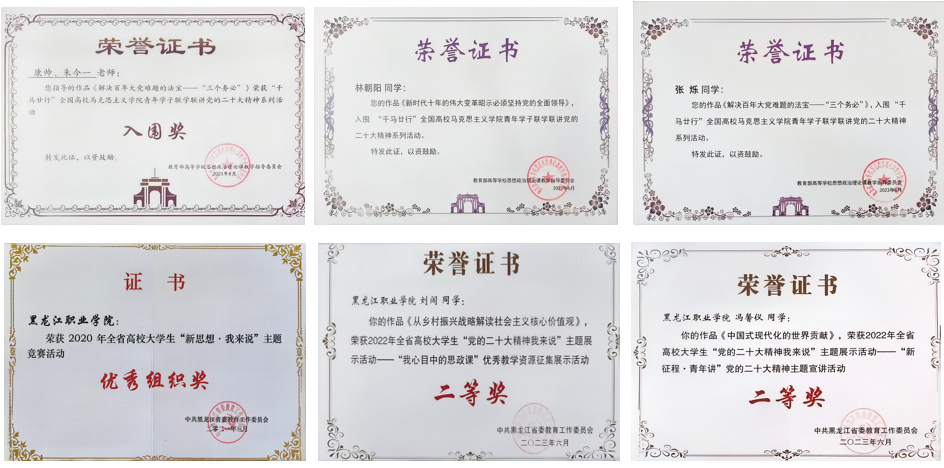 成果鉴行,彰显大思政课成效。学院教师连续5年悉心指导学生参加各类比赛,斩获累累硕果。获教育部奖项9项、省级奖项8项、优秀组织奖1项。培养了一批批理想信念坚定、人格健全、具有家国情怀、有责任担当的优秀学生,在各自的岗位上践行工匠精神,贡献自己的青春热血,彰显龙职学生“自强有为、兴业报国”的志向与担当,为社会进步注入源源不断的活力与希望。