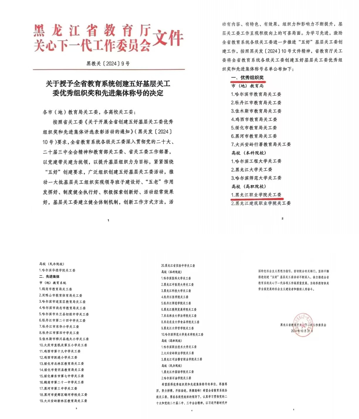 近日,省教育厅关工委先后下发《关于授予全省教育系统创建五好基层关工委优秀组织奖和先进集体称号的决定》和《黑龙江省教育厅关工委关于公布2024年 “读懂中国”活动获奖名单的通知》,永利官网关工委在两项活动中表现突出,喜获佳绩。