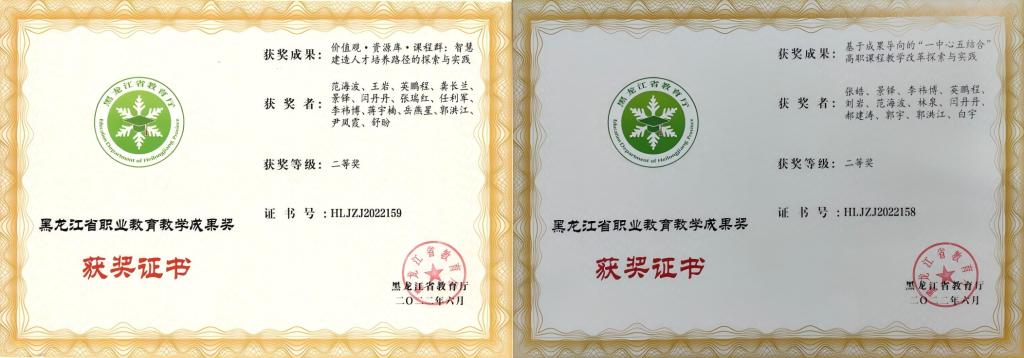 学院多次荣获省级及校级教学成果奖。2022年,范海波、张皓申报的教学成果荣获黑龙江省职业教育教学成果二等奖;2024年,学院共获校级教学成果奖4奖,范海波、张皓、英鹏程三位教师为主持人的教学成果在省级教学成果奖申报中脱颖而出,占据了永利官网申报省级教学成果奖中的三席。学院将不断提升教育质量,为培养适应时代需求的高素质技能型人才贡献力量,持续推动学院教育教学迈向新的高度。