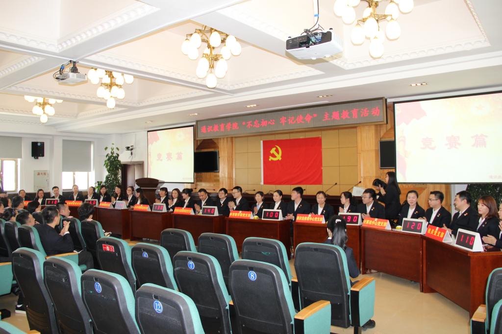 主题教育活动分为三篇。第一篇是“双讲”篇,是为了贯彻落实学校党委“不忘初心、牢记使命”主题教育活动安排和深入开展“讲龙职好故事,讲好龙职故事”主题“双讲”活动要求,学院党总支坚持自下而上、自上而下的原则,从112名教职工中遴选出7个先进典型,这些典型代表性强、辐射面广,示范作用突出。通过对典型事迹的深入挖掘和提炼,通过宣讲人生动地讲述、对大家进行了一次精神洗礼,达到了崇尚先进、弘扬正气、凝聚力量,推动工作的目的。第二篇是竞赛篇,是对前段时间学习一次集中检验,也是对下一步学习十九大精神的再动员、再部署。竞赛由必答题、抢答题、观众题三个环节组成,现场气氛严肃、热烈,达到了以赛促学的目的。第三篇是宣誓篇,由党总支书记孔繁海领誓,全体党员起立,举起右拳,面对庄严的党旗重温了入党誓词,使大家经受了一次深刻的党性锻炼和精神洗礼,增强了全体党员干部不忘初心、继续前进的坚定信心,积极推动通识教育学院在助力优质院校建设、成果导向教育教学改革和学院转型发展的新征程中再创新辉煌!