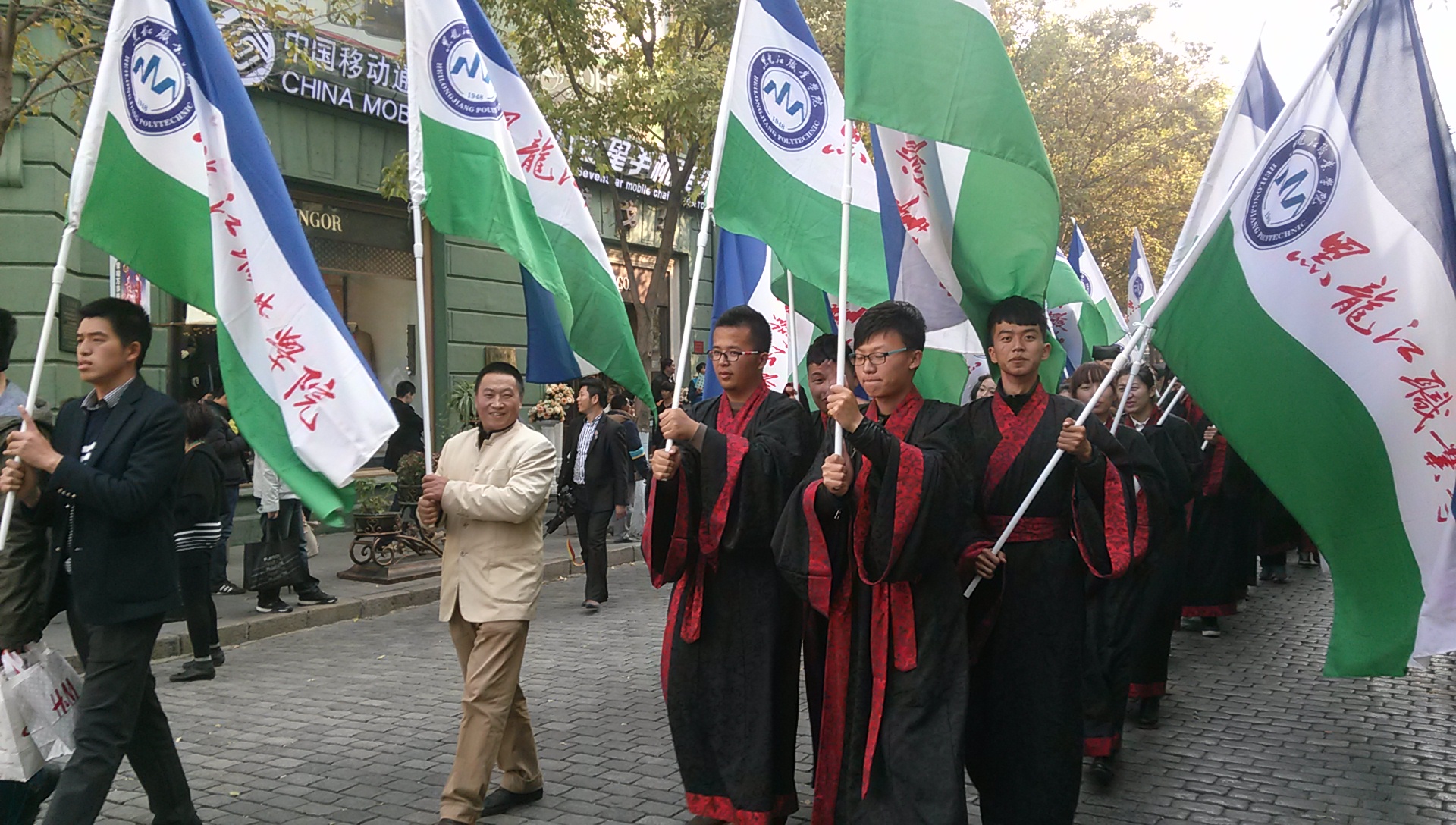 随后,参加成人礼的学生们身着汉服、高举旗帜在中央大街宣扬社会主义核心价值观和“自强有为、兴业报国”的学院精神,这一行动,引起了中央大街上往来行人的广泛关注,得到了社会的良好评价和高度认可。有的行人还不时称赞永利集团88304官网的学生具有高素质,高情商。