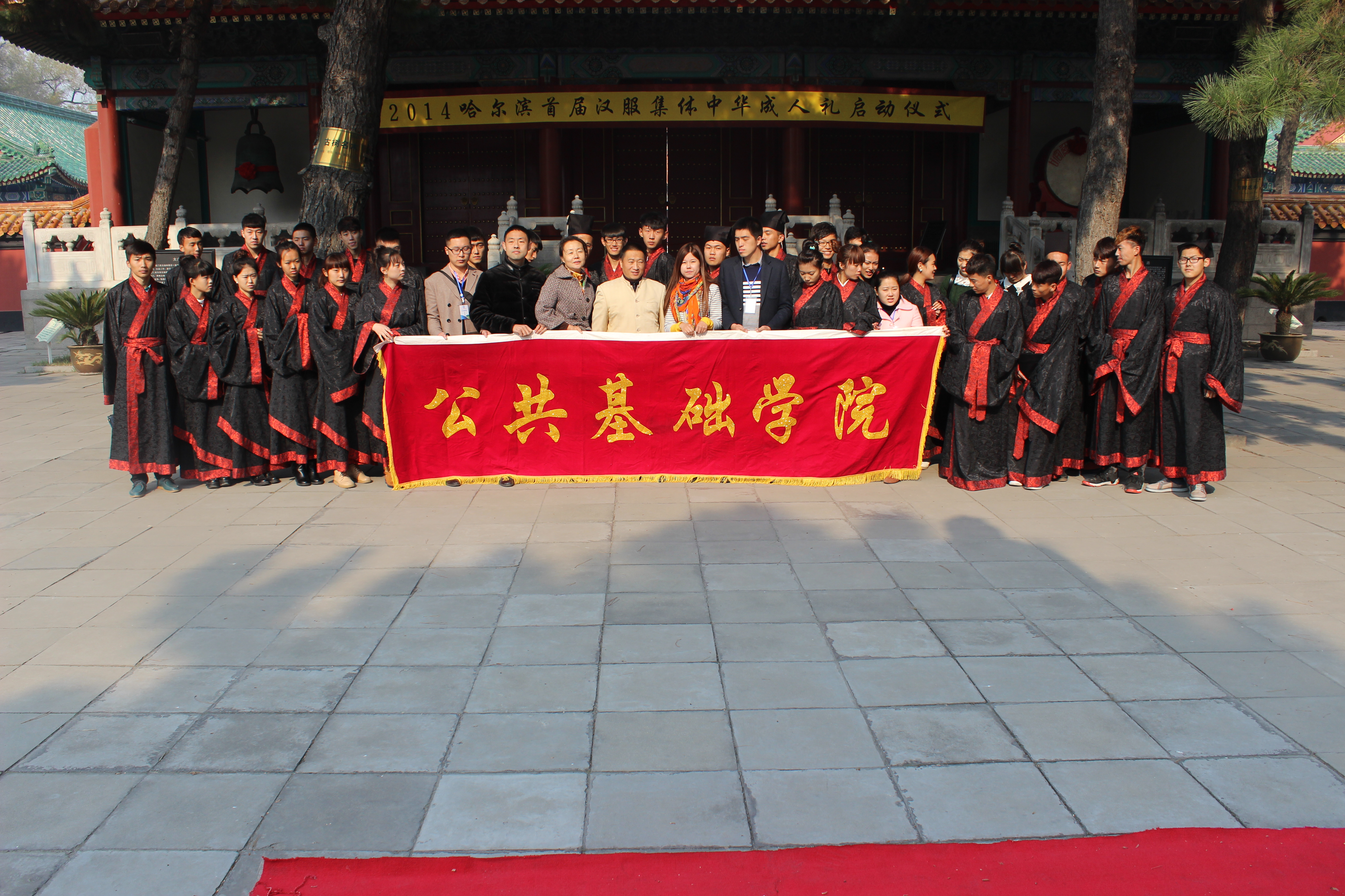 10月18日上午9时,永利集团88304官网50余名师生在民族博物馆大成殿前参加了“哈尔滨首届汉服中华成人礼启动仪式”。本次活动是由中共哈尔滨市委宣传部、中共哈尔滨市委精神文明办主办。公共基础学院程刚书记带队,辅导员姬虹、吕静、韩进、王谦携45名学生,工商管理学院辅导员于德洋,建筑工程学院辅导员鲁明及部分学生参加并观摩了成人礼仪式,共同接受传统文化的洗礼。活动中,程刚书记发表了重要讲话。