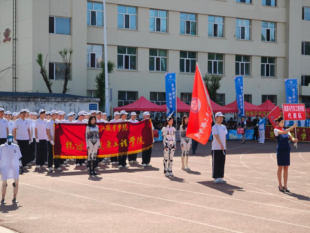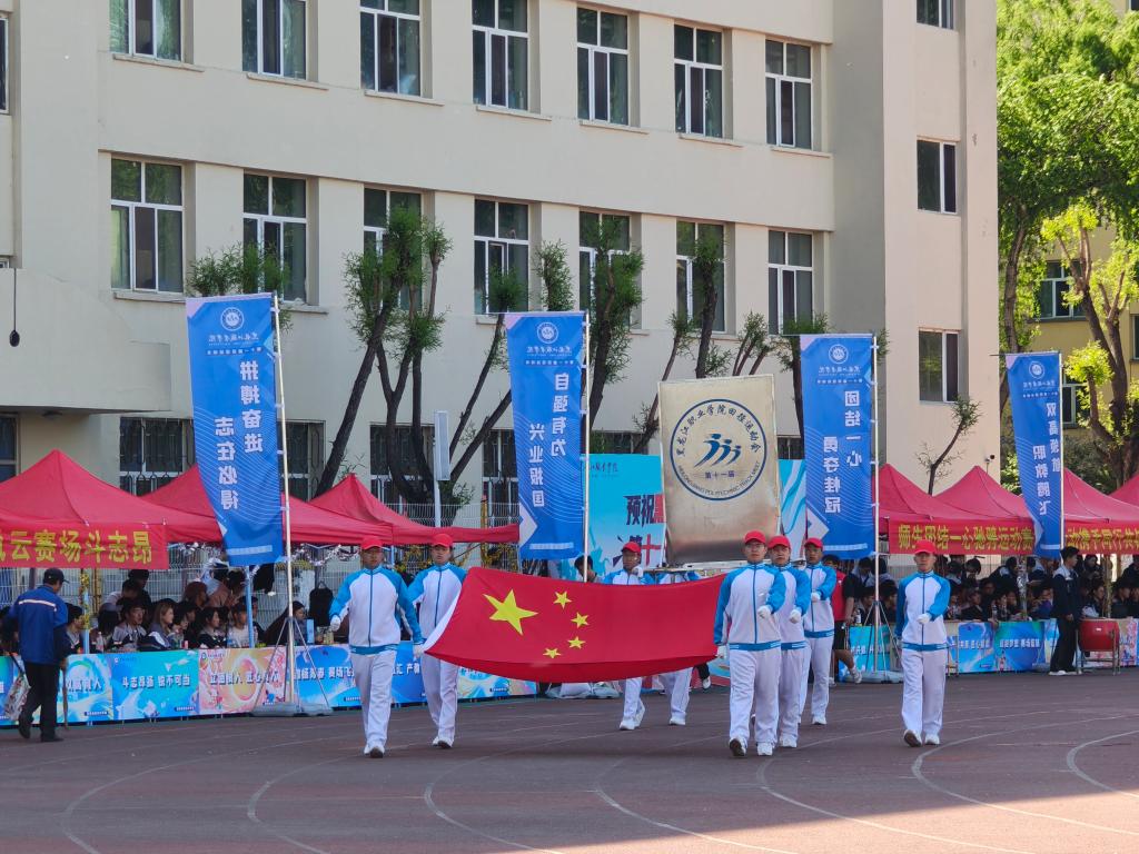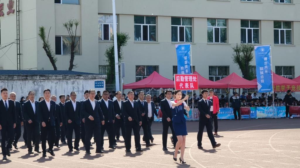 伴着嘹亮激昂的乐曲,国旗护卫队、会徽队、标语队、刀旗队、花束队、花环队、礼仪队、参军预备队和各代表队迈着坚定有力的步伐经过主席台迎接检阅。他们昂首挺胸,嘹亮的口号如春雷激荡,展现出龙职学子昂扬向上的精神风貌。随后,288名学生共同演绎大型团体操《龙腾职苑 筑梦新程》,变幻的队形定格为“龙职加油”四个遒劲大字,表达对学校的深情祝福,醒目的“十一”字样,则象征着本届运动会的辉煌时刻,彰显龙职人团结奋进、勇攀高峰的拼搏精神。