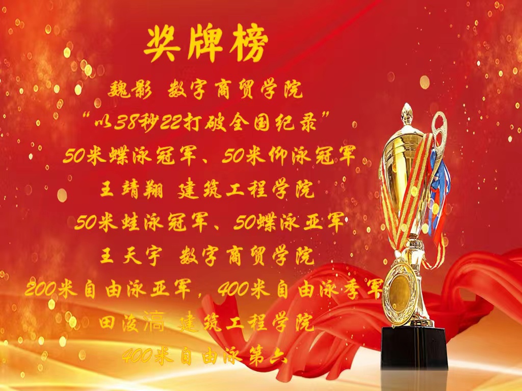 本次赛事由中国学生体育联合会主办、兰州市体育局承办,是我国大学生游泳项目的最高赛事之一,将全国高校分为“北方赛区”和“南方赛区”,北方赛区赛事规模宏大,共有北京大学、清华大学、北京体育大学等80所高校733名运动员参赛。这是永利官网游泳队首次冲进全国比赛,他们奋“泳”拼搏,发挥出色,经过四天激烈角逐,队员们凭借单项赛事的优异成绩荣获乙组女子团体总分第二名、乙组男子团体总分第四名、乙组团体总分第四名。数字商贸学院的魏影同学夺得女子乙组50米蝶泳和50米仰泳两项冠军,并以38秒22成绩打破女子50米仰泳项目的全国赛会纪录。