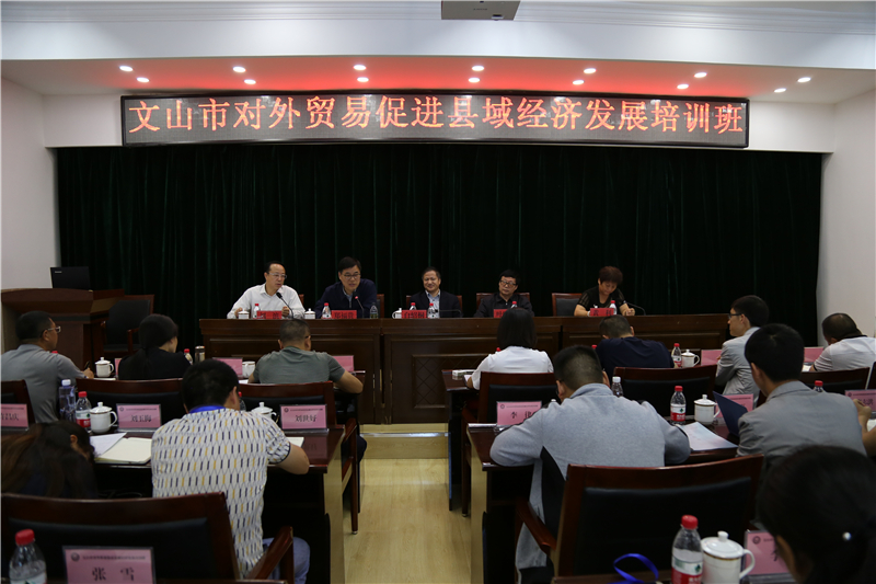 6月12日,文山市对外贸易促进县域经济发展培训班在永利官网举行,48名文山市委、人大、政府、政协领导、市级各部门分管领导、乡镇(街道)领导干部、业务骨干、部分外贸企业负责人参加培训。学校副校长郑福贵,省政府参事叶晓峰,哈电集团党委常委、纪委书记白绍桐,文山市人大副主任黄利,文山市副市长刘滨出席会议。