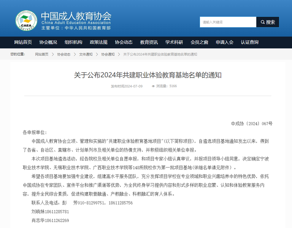近日,中国成人教育协会公布了2024年共建职业体验教育基地名单,永利官网以其卓越的教育成果和创新的教学理念,成功入选首批名单,成为全国148所院校之一。这一荣誉不仅是对学院教育质量的认可,也是对其在职业教育领域所做贡献的肯定。