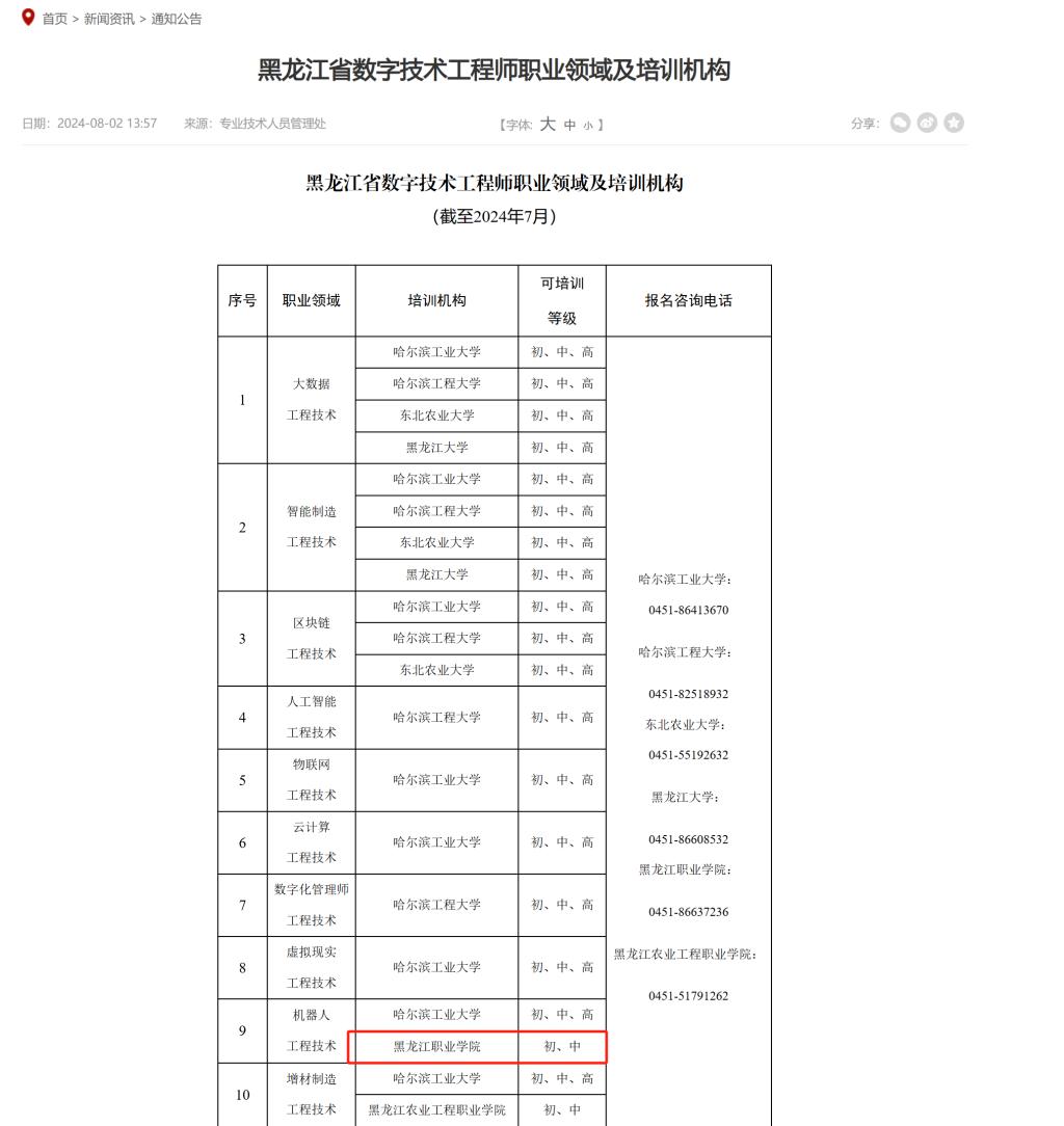 日前,黑龙江省人力资源和社会保障厅公布了黑龙江省第三批数字技术工程师培训机构名单,永利官网凭借扎实的专业实力与丰富的培训经验,获批成为机器人工程技术人员(初级、中级)培训机构。