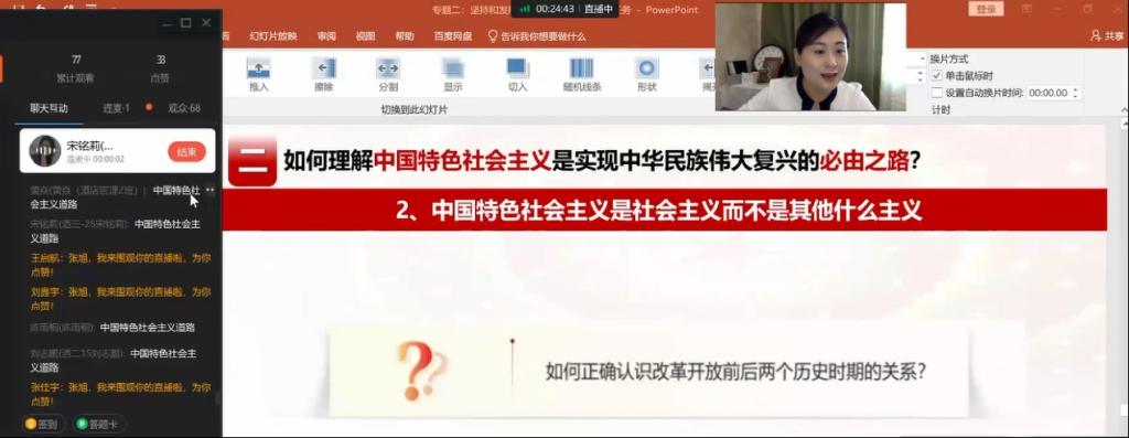 课前,张旭老师与学生亲切交流节日感受,从“每逢佳节胖三斤”的餐桌美食看国家发展变化,润物无声般让学生进入上课状态,点亮课堂。课中张旭老师采用问题导向教学法,让问题由浅入深逻辑成链,将学理内容转化为教学内容,用学生听得懂的语言讲清、讲透理论内容,符合学生认知特点和规律。在张老师的引导下,学生积极与老师交流互动,虽然是线上课堂,但是隔屏能感觉到热烈的课堂气氛,赢得了省教育厅专家的赞扬和认可。