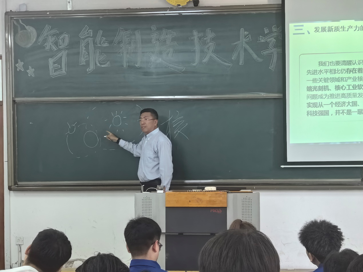 为深入学习贯彻习近平新时代中国特色社会主义思想、党的二十大和二十届二中全会精神,充分发挥校领导在思政课建设中的示范带头作用,6月7日,副校长何志鹏走进《形势与政策》课堂,以“以新引质 向新而行——如何理解新质生产力”为题,为22级工业机器人、工业学徒专业学生讲授了一堂“含金量”十足的思想政治理论课。