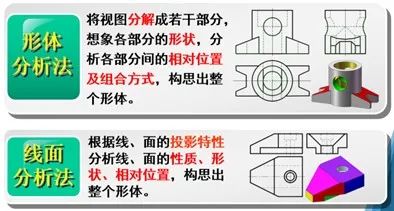 采用讲授法讲解两种常用的读图方法:形体分析法和线面分析法,并举例。形体分析法适用于形状和结构清晰的组合体读图,线面分析法适用于切割式组合体读图和视图难点部分的分析,如图4所示。