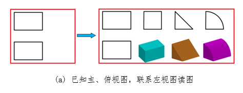 采用问题引入式,引入两组视图,如图2和图3所示,采用讲授式、启发式和讨论式讲解理论知识。由图2可知,两个视图不能唯一确定它们所对应的形体,需要把几个视图联系起来分析。分析图2和图3可知,抓住立体的特征视图能既快又准确的构想出相应的立体,读懂图样。