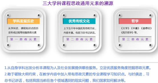深入分析三大学科对人类及社会发展承载的主要功能,分析三大学科的根本关系,依据学科为人类发展及社会进步服务为原则,对三大学科的“公共课程思政元素”进行溯源。从三大学科视角出发,公共的课程思政元素的溯源内容主要包括“学科发展历史、中国优秀传统文化及中西方哲学”。