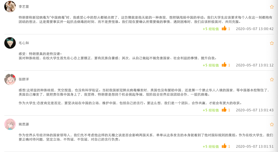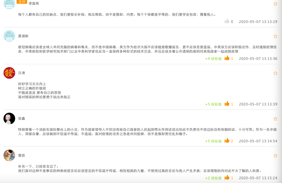 (3)分享时事动态和热点话题:突如其来的疫情是当下大家都非常关注的大事,通过观看特朗普称新冠病毒为“中国病毒”不仅强调了歧视的理论知识、融入了思政元素,更加激发了学生的一颗爱国之心。