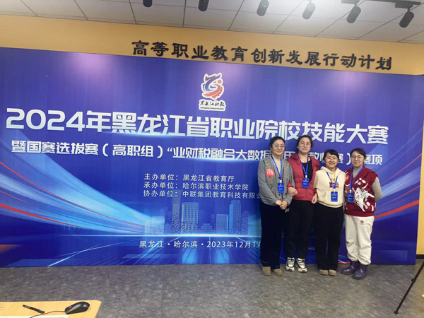 12月17日,在2024年黑龙江省职业院校技能大赛暨国赛选拔赛“业财税融合大数据应用(教师赛)”赛项比赛中,王欢、宋薇、田思邈、刘鹏(大)四位教师组成团队以第一名成绩晋级国赛。