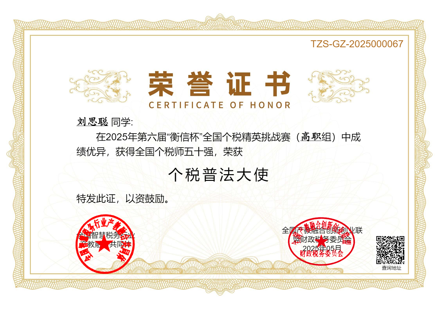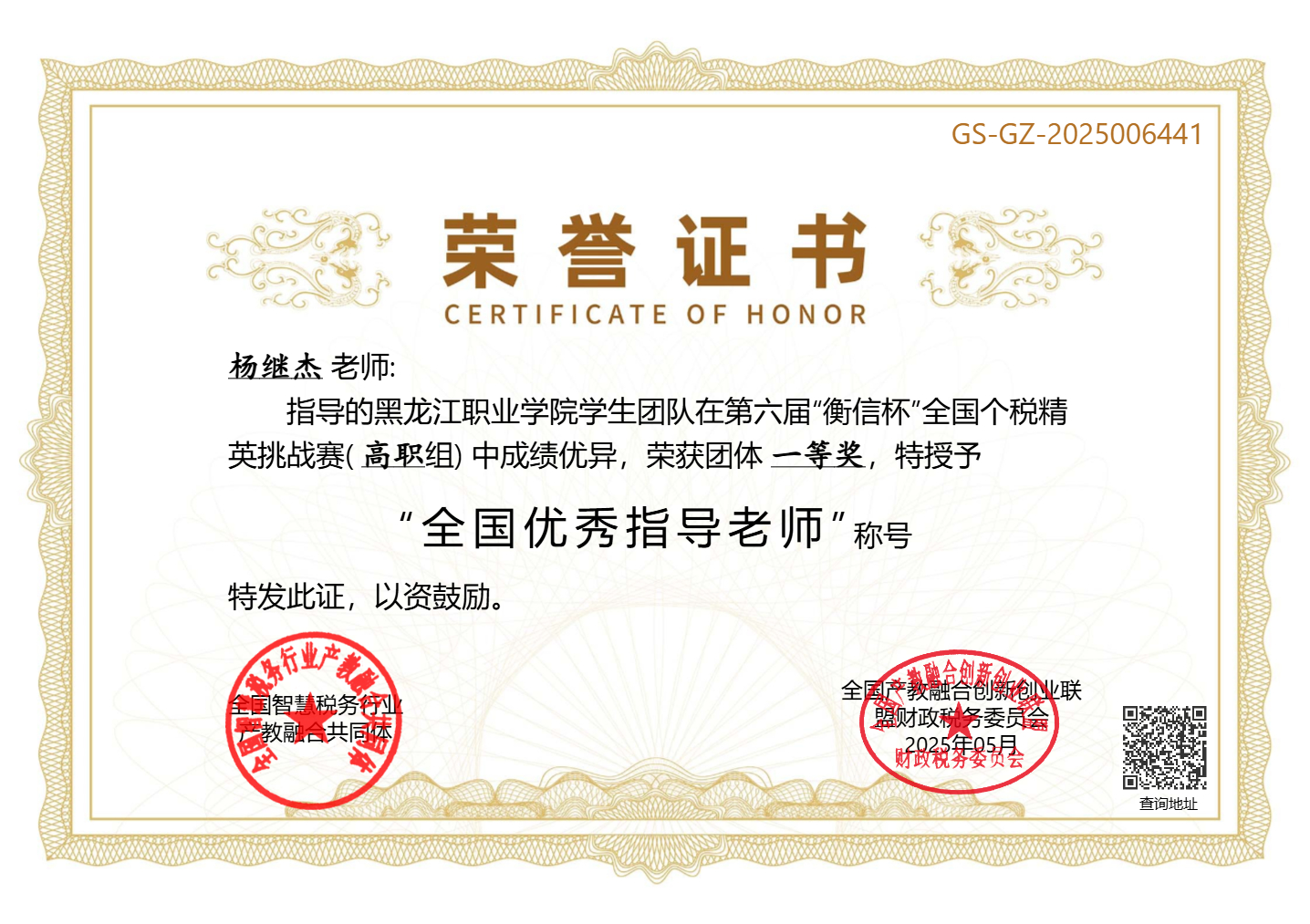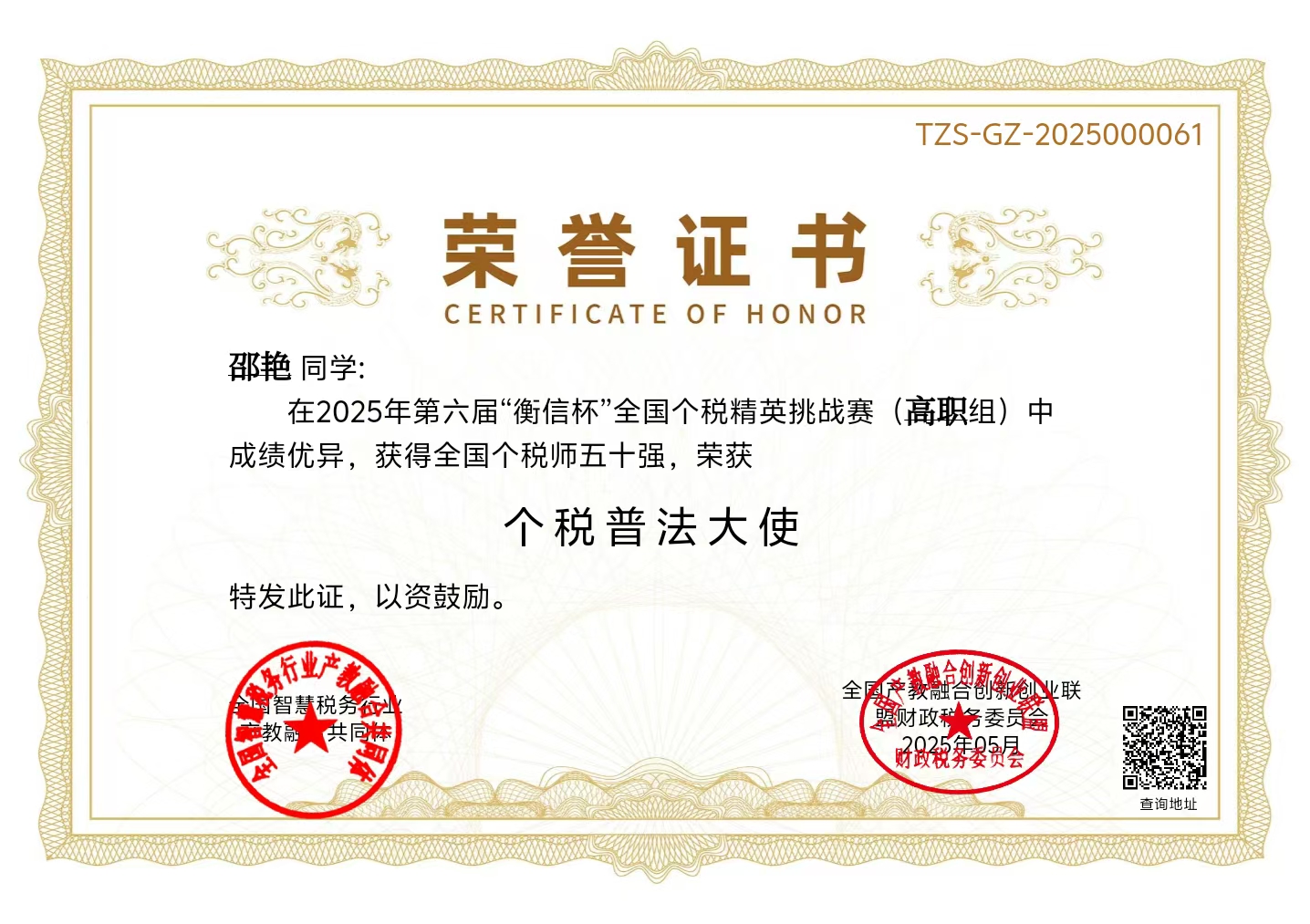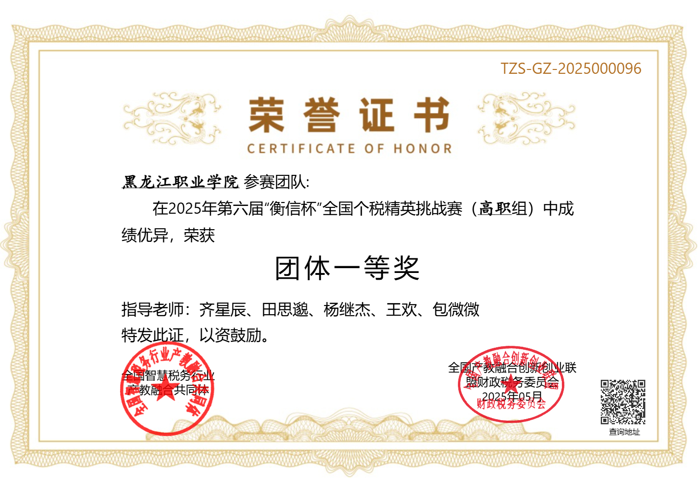 我院喜获2025年第六届“衡信杯”全国个税精英挑战赛(高职组)团体一等奖