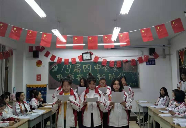 本次团日活动在各班级团支书的带领下,同学们迅速的完成了活动板报,班级的布置和相关准备工作。首先团支书以宣读相关十九大报告的形式开展,报告内容丰富,既有理论深度、思想深度,又有很强的针对性,为进一步加深对党的十九大精神的全面认识和准确理解提供了重要指导和启发。接着在团支书的带领下同学们齐读了《公报》并奏唱了国歌,同学们也对公报发表了个人见解和看法。最后同学们以小组的形式讨论了十九届四中全会的精神,对十九届四中全会的精神有了全面的认识和更进一步的了解。