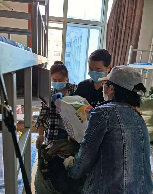 5月23日分院学管院长、学管办主任、专职辅导员7人兼职辅导员3人12人另携4名家属准时到达培训楼经过扫码和体温检测后按照分工大家各司其职、各负其责有序开始学生寝室的打包现场与学生视频通话、物品标记和搬运工作。10点10分完成了所有学生的物品搬运和寝室的清空。