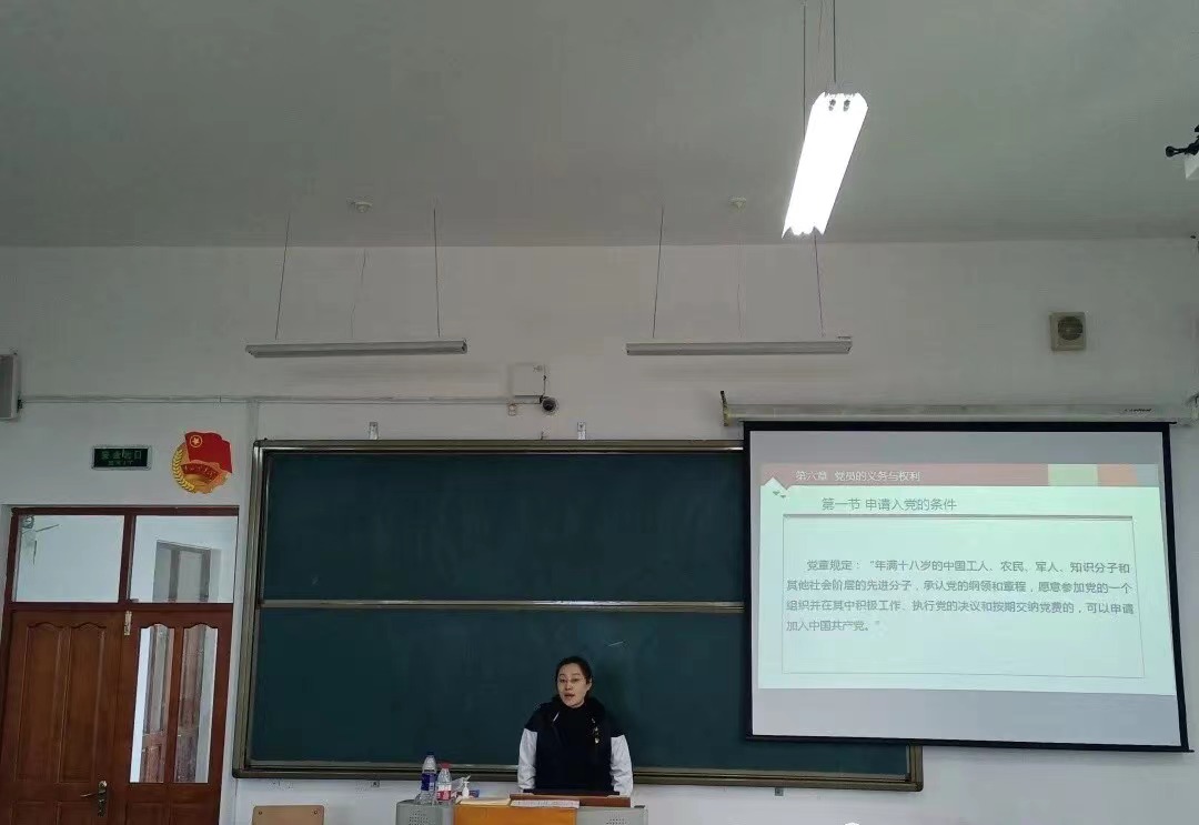 在讲课过程中,她通过对全面提高党的建设科学文化水平、中国共产党的义务和权力等方面教育,使本期培训班同学深入了解党员的义务和权力,了解发展党员工作的基本程序和要求,并要求同学们增强入党的自觉意识,提高理论水平,端正入党动机,坚定理想信念。