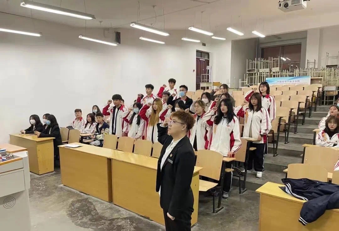 在庄严的团歌声中,新团员入团宣誓仪式正式开始。会议第一项,团总支副书记贾英琦宣读新团员名单。会议第二项,2020级团支书为新团员佩戴团徽,并由2020级优秀团支书于沛琪的领誓,各位新团员面向团旗、右手握拳举过肩,在团旗下庄严宣誓。一句句坚定的誓言,是永不磨灭的崇高理想与信念。
