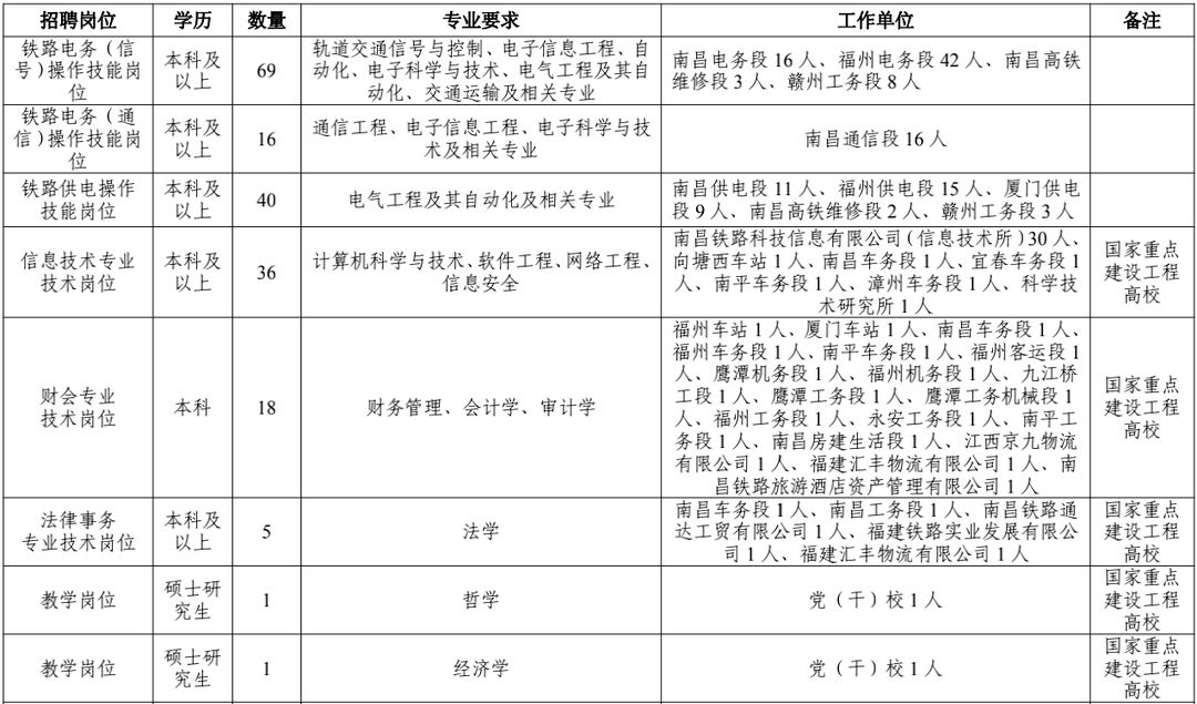 (1)应聘序号为1-13的岗位:要求铁路主专业毕业生在校期间所学专业方向为铁路专业方向或所学主要课程中包含铁路专业课程,相近专业为高质量院校毕业生;
