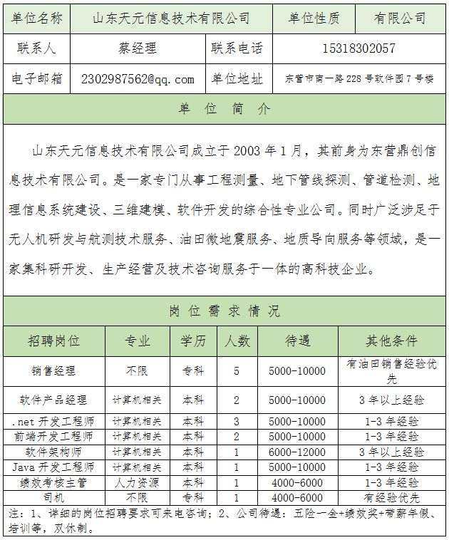 一、山东天元信息技术有限公司岗位信息表