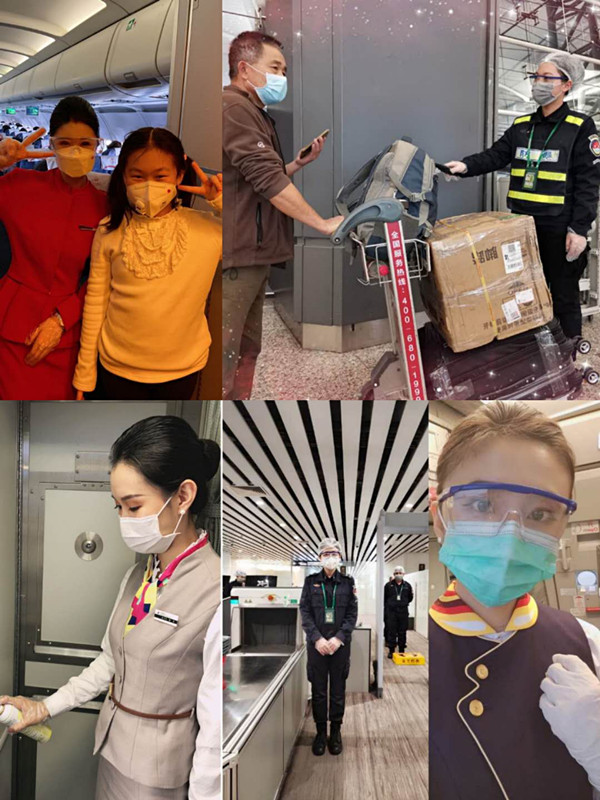 学院2017级空中乘务专业学生周慧鑫同学目前在天津航空乘务员岗位实习,自疫情发生以来,她一直坚守在工作岗位,有时候要飞早班航班,她凌晨3:30起床,4:45进行二次签到,5:15从驻地出发,到达机场后要陆续完成酒精检测、取证件、给乘务长航前小条、航前准备会、进场安检、登机等规定程序,按照机场要求完成对乘客安全检查和测温等工作。面对突如其来的疫情,有的乘务员提出休假请求,而周慧鑫同学始终坚守岗位,她说:“自疫情发生以来,航空公司领导高度重视机组与乘客的自我保护、安全问题,给我们乘务员也配备口罩、手套、护目镜等防护用品,刚开始飞的时候有些担心,但是再难,自己也要坚守下去。保护好每一位乘客,让他们之间避免交叉感染,始终以最饱满的精神面貌为乘客提供服务,安全送达到目的地是我们的职责。”
