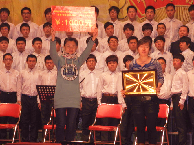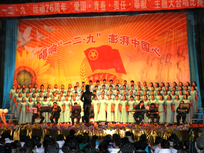 我院在12月9日院团委举办的一二·九大合唱比赛中荣获一等奖。本次合唱比赛之所以成功主要有以下几点:首先是分院领导高度重视,并从财力、人力、物力上给予的大力支持,充分保证了本次活动达到预期效果;其次是特点鲜明,通过展示从拉萨布达拉宫到哈尔滨沿途的景点,自然地把旅游专业融入到活动中,同时也是响应近期冯书记提倡的关注藏族学生的号召,与学院党委保持高度一致。再次是组织严密,落实到位。提前动员从学期初开始计划在第二届艺术周期间通过举办分院合唱比赛来调动新生的积极性,为一二·九合唱比赛做充分动员和准备。比赛前一个月把工作细化,责任落实到人,分组进行训练。同时有道具、舞蹈、合唱、指挥、小品、朗诵、采购组等六个小组一起协调配合,经过一个月来的积极筹备和紧张排练,最终取得了胜利。