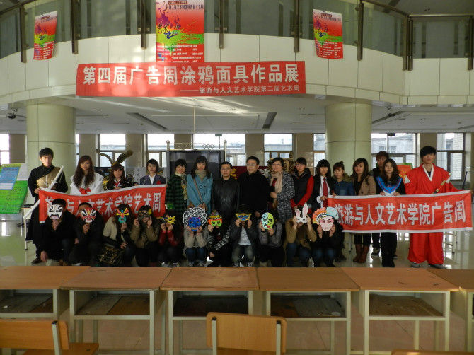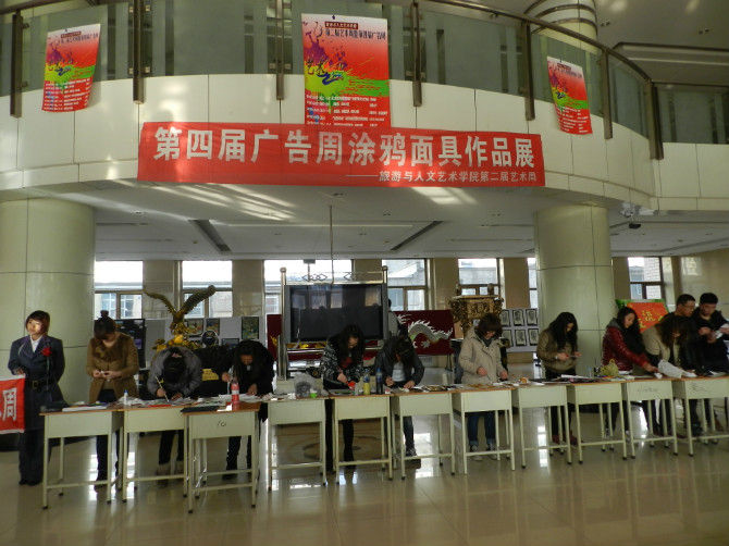 2011118下午,由我院举办的涂鸦面具展在主楼大厅顺利进行,展览作品由我院11级广告设计专业同学现场设计制作。