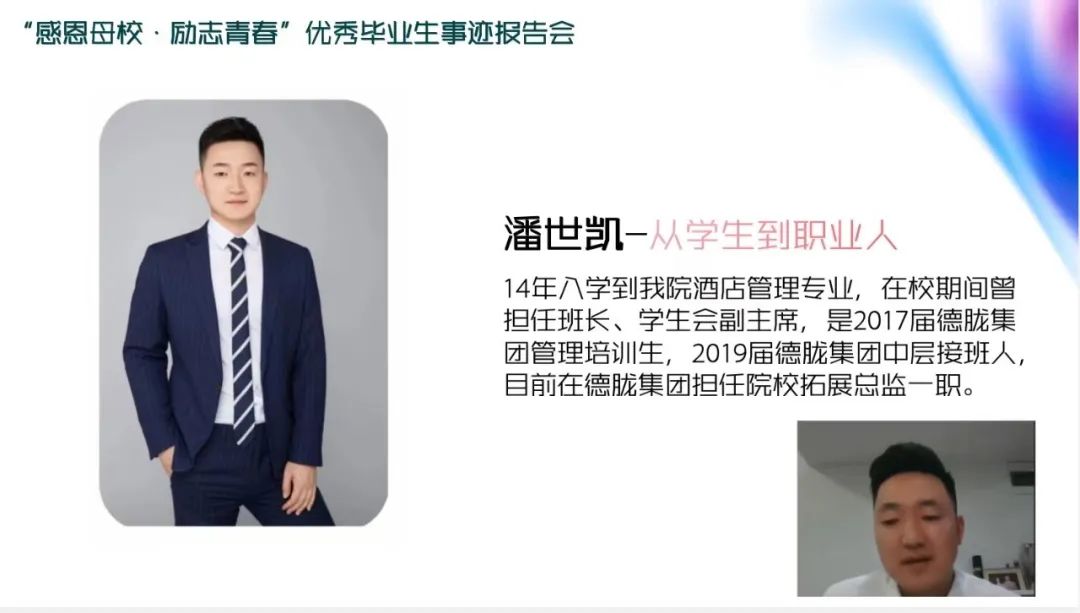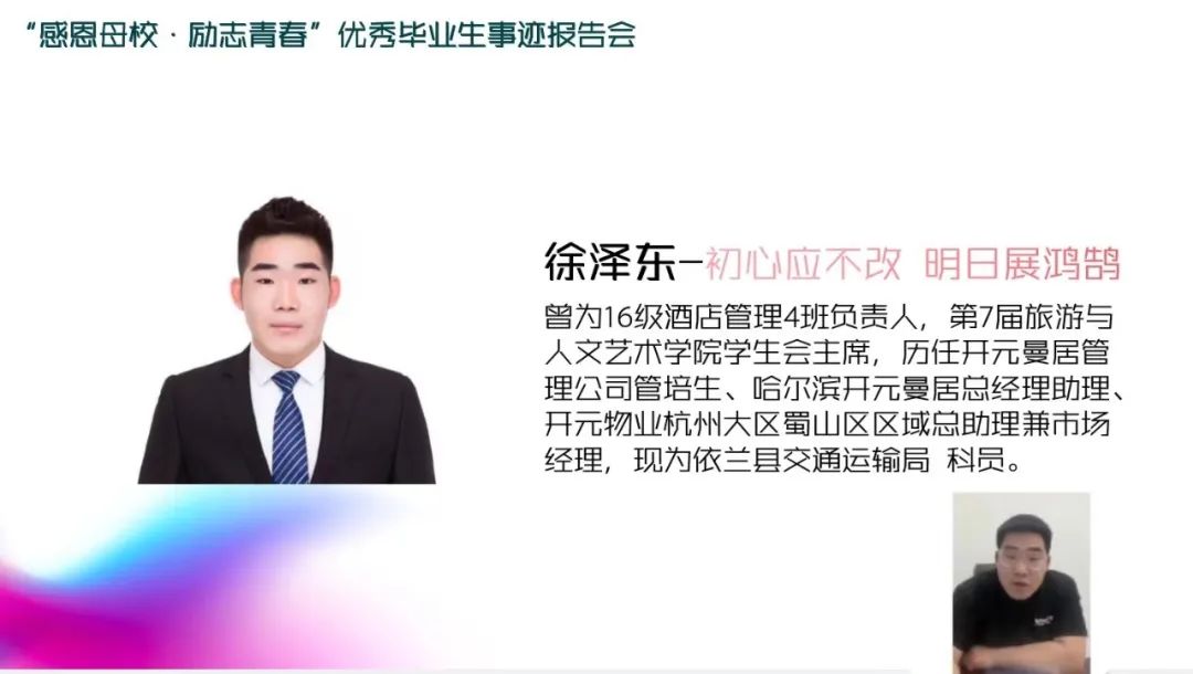 4月17日,永利官网旅游与人文艺术学院以网络视频形式召开了“感恩母校·励志青春”优秀毕业生事迹报告会。本次报告会是永利官网第七届“铺路石文化节”暨庆祝“龙职”成立10周年系列活动之一,5位优秀毕业生代表和2020级、2021级学生分享他们在学习、实习、求职过程中的难忘经历。学院党总支副书记杜超、学管办主任徐金然及学院全体辅导员教师参加了会议。会议由辅导员卢丙洋主持。